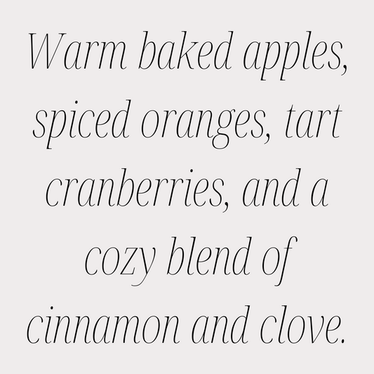 A luscious blend of tart cranberries, juicy apples, and spice. Top notes of orange peel and apple sweeten the cranberry heart, while cinnamon, clove, and sugar wrap all the fruits together into a delectable aromatic treat.